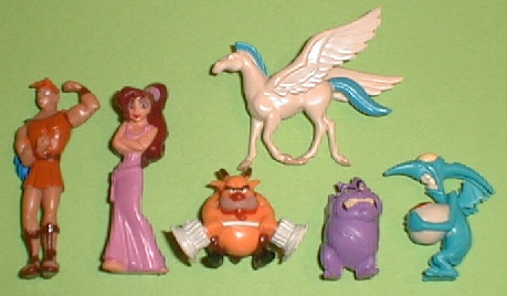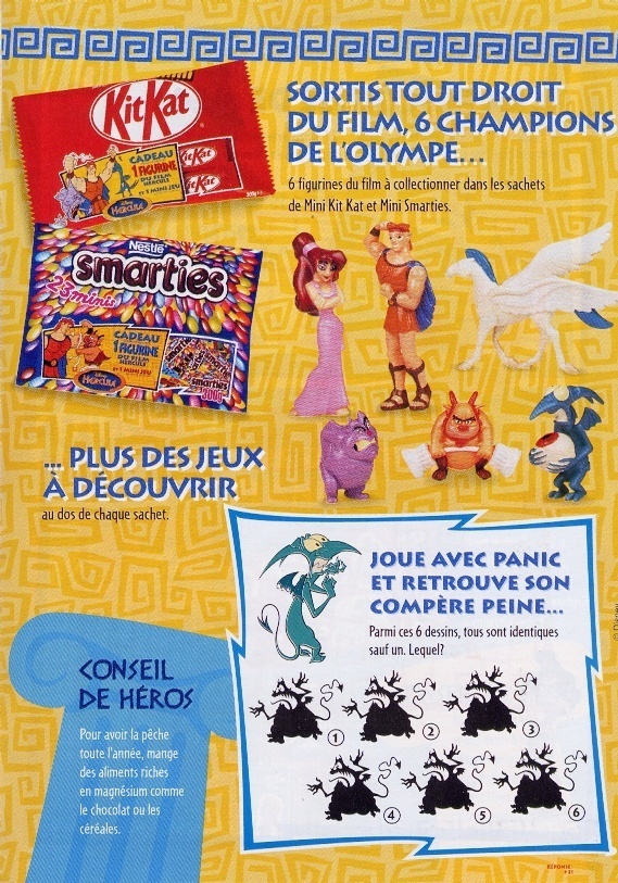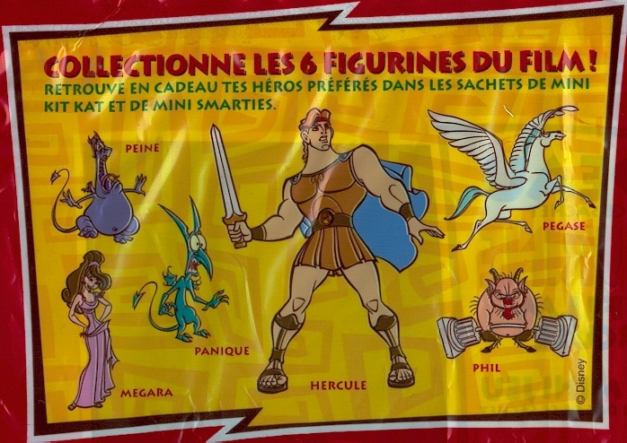 Nestlé - Hercule Mini Smarties - Mini Kit Kat - 1997 Photo de la série complète. Photo de l'emballage. Publicité du livret Nestlé fête Hercule.