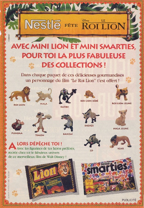 Nestlé - Le Roi Lion Mini Smarties - Mini Lion - 1994 Photo de la série complète. Papier de la série (recto/verso). Publicité de 1994.