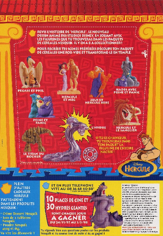 Nestlé - Hercule Céréales Nesquick - Trio - 1997 Photo de la série complète. Photo de l'Hydre géante offerte par Nesquick grace à un concours téléphonique en 1997/98. Photo de l'emballage.