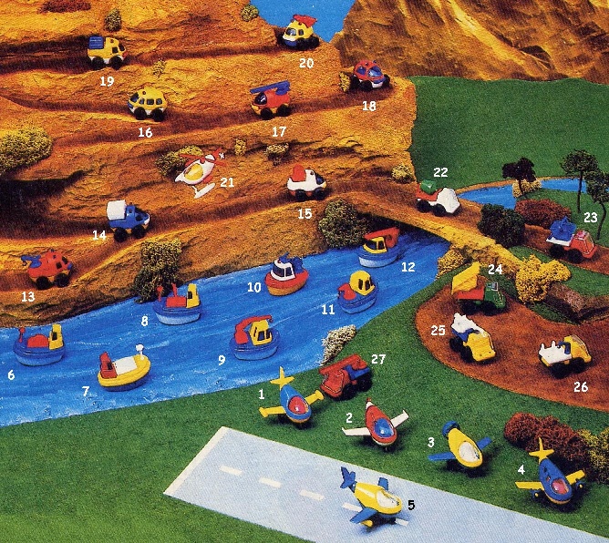 Nestlé - Véhicules "Jouets surprise" Chocolat Nesquik Photo d'une publicité (avec le regretté Grosquik disparu pour cause d'embonpoint). Numérotation des véhicules (cliquez pour agrandir).